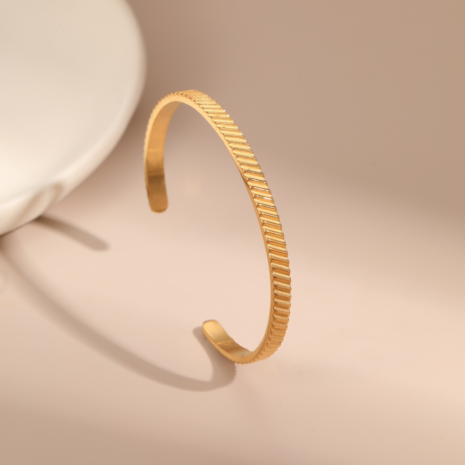 Modern and refined, this engraved textured bangle is crafted from premium stainless steel for durability and lasting shine. The subtle diagonal pattern adds a touch of sophistication and depth, making it a perfect accessory for both casual and elegant looks.